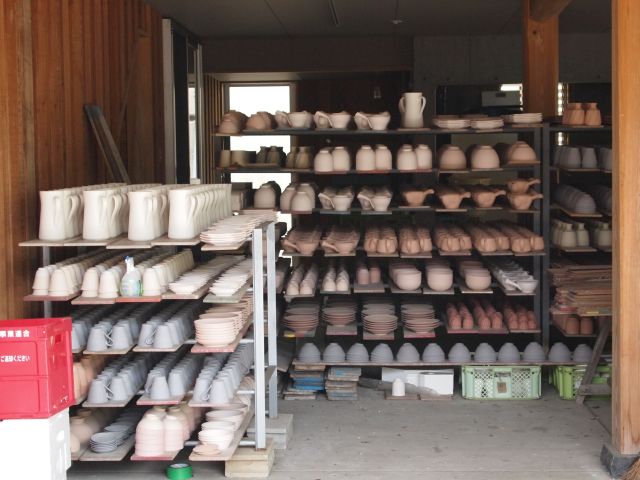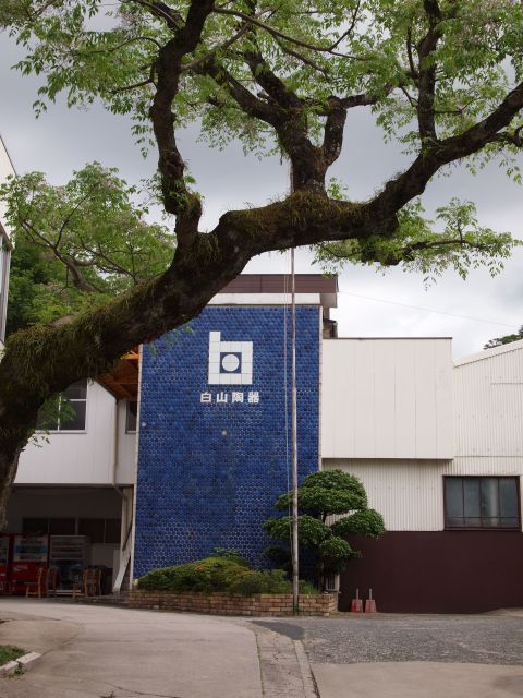 こちら白山陶器の本社、陶器のタイルを張った青い壁がステキです。ショールームがあり、新作なのか、本社限定なのか、見たことないシリーズも..。