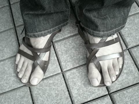 そろそろサンダルの季節も終わり。皮のサンダル - 守備力1。電車で足を踏まれるとイタイ!