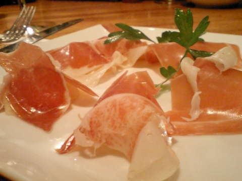 まずはプロシュートと季節のフルーツで、生ハムメロン ならぬ 生ハムピーチ。桃との組み合わせは初めてだが、これがナカナカ合うのです。知ってる人は知っている、良くある組み合わせのよう。