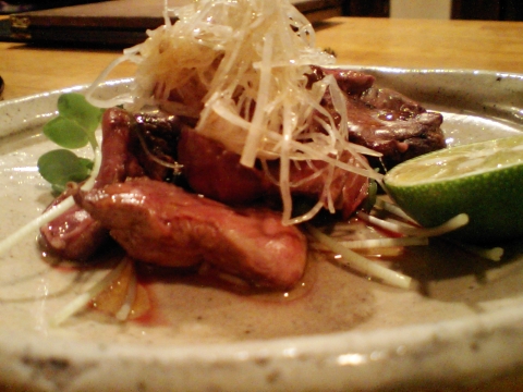 お造りは「今日はイサキとカサゴが絶品」との事で、加えて金目、ミル貝、鳥貝など。自家製胡麻豆腐は、黒胡麻でなく白胡麻を使っているのか、色が白いのに胡麻の風味はしっかり。目の前で備長炭で焼いてくれる野菜焼きは、塩水をくぐらせて下味を付けてあるらしく、ほんのりとした塩加減が絶妙。写真の白レバーのたたき、エボ鯛の塩焼き、牛すじポン酢、カブの昆布和え、出汁巻き卵...。