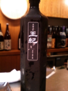 外を歩いて体が冷えていたので、焼酎お湯割りでスタート。大手ブランドのパーティーなどで振舞われたりする「王紀」という珍しい黒糖焼酎をチョイスしてもらう。さすがボトルがかっこいい!