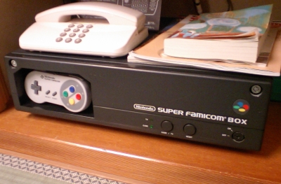 ふと見ると、備え付けのテレビの下に、見慣れたコントローラーと見た事もない機械。ゲーム業界に居ながら誰もしらない「SUPER FAMICOM BOX」というものでした。プレイするには有料放送のカード(エッチな放送とかも見れるヤツ)が必要なので、さっそくエレベータ脇の券売機で購入。遊べるのは マリオカート、マリオコレクション、スターフォックス、ゴルフ、麻雀 の5本。