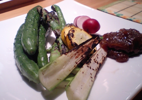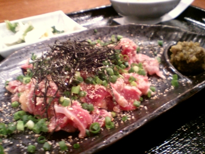 ランチで 薩摩地鶏の湯引き を食べる。サッと湯引きしただけで、ほとんどナマ。柚子胡椒でピリリと食べます。ん~焼酎が欲しくなる...。