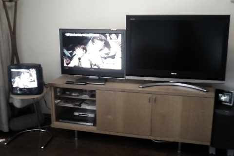 こうやって並べて見ると、32インチと42インチは、対角線の長さではたった10インチだけど、面積にすると2倍になっている。つまり1サイズ(5インチ)アップすると面積にして1.5倍くらいになるって事ですね。