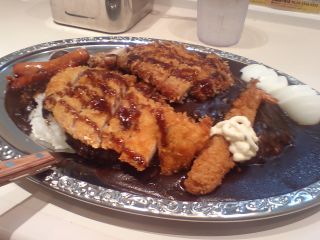 エビフライ、ロースカツ、チキンカツ、ソーセージ、ゆで卵がトッピングされたメジャー級のカレー。通常1550円のところ何のキャンペーンか知らないが1000円になっている。厨房を覗いていると、お皿一面にご飯をペタペタ、ギュッギュッっとシャモジで圧縮している。ヤメテ~ご飯はパラフワリと軽く盛ってくれればいいから。