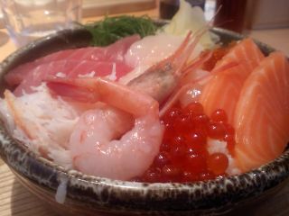 今日はブランチを見て来た人が多いようで、ほぼ満席状態。壁には取材を受けたばかりのブランチの色紙が...。1100円とチョイお高いが定番の海鮮丼を注文。カニ、イクラ、サーモン、ホタテ、マグロ、エビ、トビッコが乗っている。どのネタも新鮮さを感じさせる旨さ。イクラ丼(600円)やサーモンとイクラの親子丼(700円)も旨そうでした。