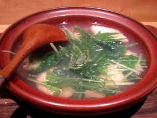 ついでに いちりん に立ち寄ると、最近他店舗の新装開店など、コンサル業が忙しかったSさんが、数ヶ月ぶりにめずらしく板場に立っている、ラッキー。時間も早いので一番乗り。いつもの通り“おまかせ”の前菜は、筍とオコゼとホタテのスープ。「今、思いついた」というメニューにはない一品から。