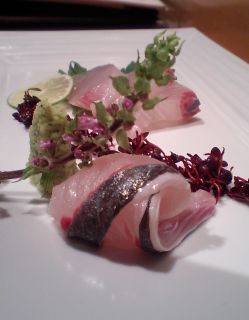 GW中という事で、活きの良いものは仕入れられないかと思いきや、生簀からすくい上げられたのは大きなシマアジ。あばれるシマアジをその場で捌き、シマアジとカンパチのお造りに。このたった二切れのために申し訳ない、けどウマイ!