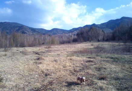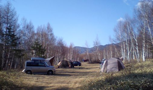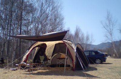 設営を終わらせて一休み。風があって少し肌寒いが、日向でゴロンするにはちょうど良い。犬達も半年ぶりの大自然の中でのびのび。