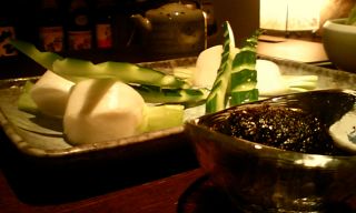←鯛味噌とネギ味噌、そして野菜にカブとキュウリをチョイス。カブって浅漬けとか軽く塩もみしたりってのは食べるけど、全くのナマで食べるのは初めて。ウマイです。鯛味噌は干した鯛の細かい身が入っているようで一番のオススメ。ネギ味噌は苦味があるので料理を選ぶし、嘗め味噌には向かないかな。。