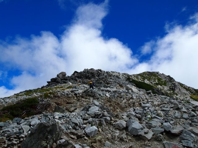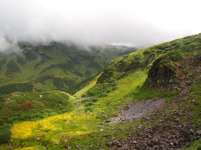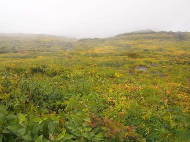 普段登る山は、基本林の中を進み、ところどころ視界が開けた場所でだけ景色を堪能する。しかし、標高 2000m を超えるココでは樹木が育たず、背の低い高山植物しかないため、常に景色を堪能しながら進めるんですよね。これが気持ちいい。