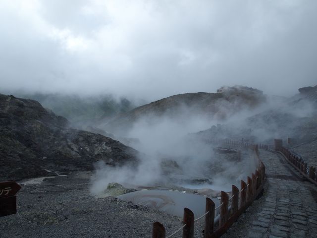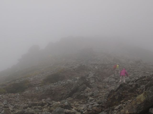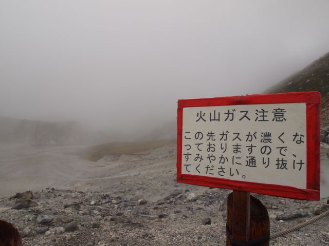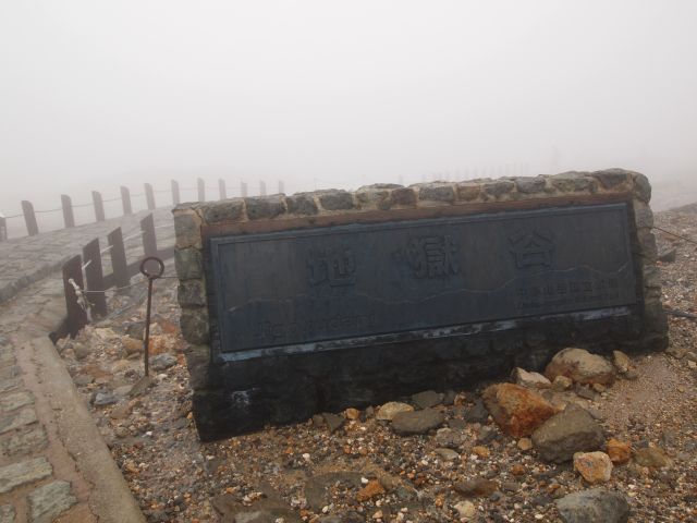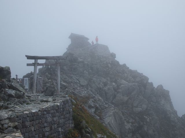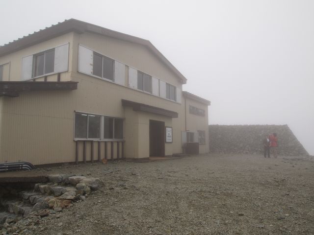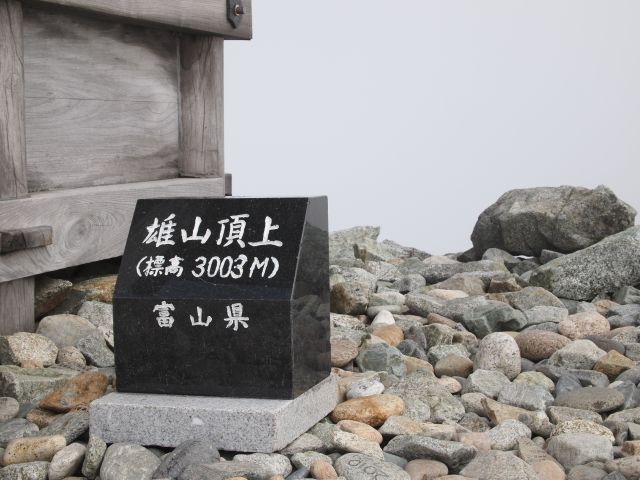 霧で先が見えない中、三の越 での休憩を挟んでひたすら登る。すると「おぉ、着いたのかっ!」ってな感じで突然山頂に到着。山頂には 雄山神社 があり、各種お守りなどが購入可能。