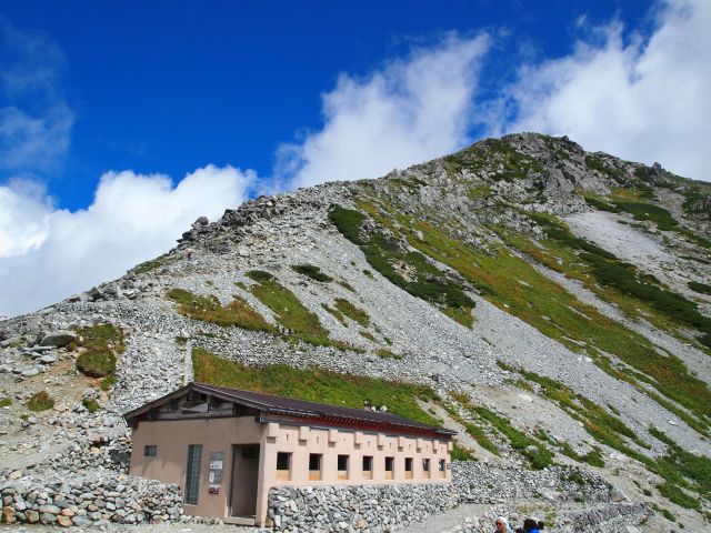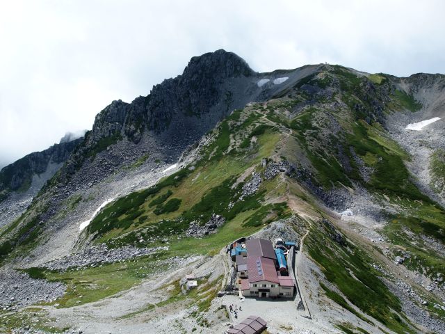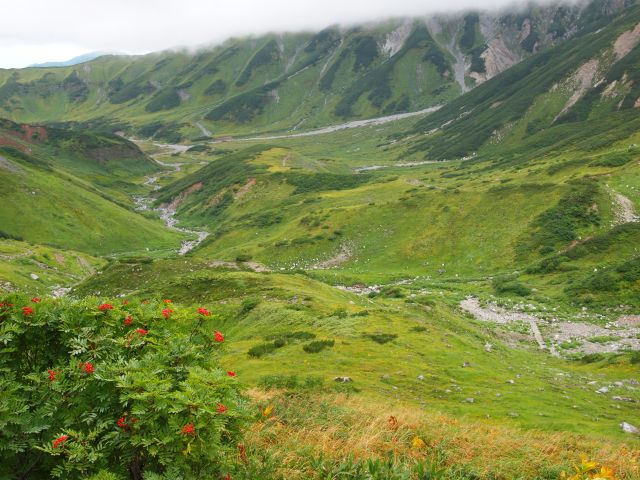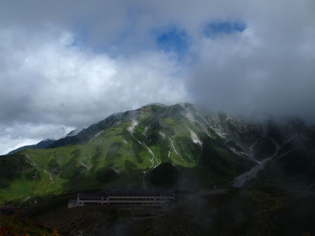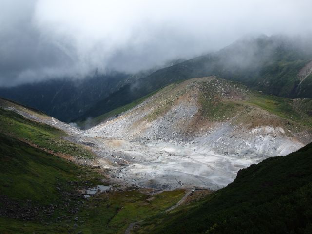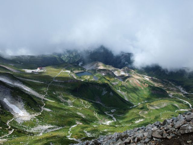 今日登るのは 雄山、かいばらゆうざんの雄山と書いて「おやま」と読む。まずは中継点となる 一の越 を目指す。上のほうは雲が掛かっているが、室堂平は一望できる状態。ハイジに出てくるようなすばらしい景色に、北アルプスの「アルプスらしさ」を実感しながら進む。