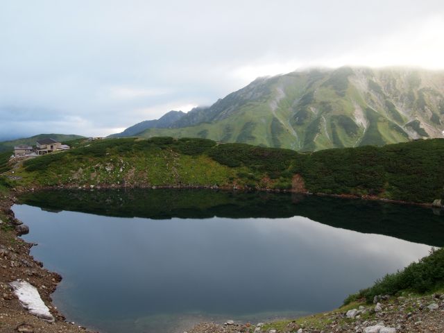 早朝、みくりが池 越しの 剱御前、左のほうに少しだけ見えるのが 剱岳。
