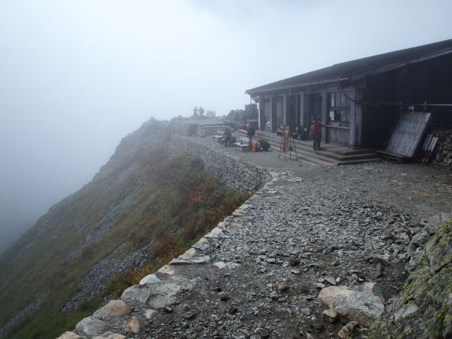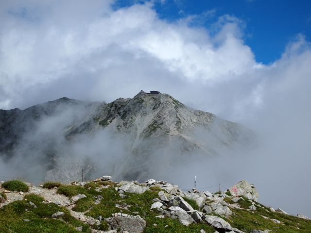 室堂ターミナルから 250m 登り、一の越 に到着、一の越 少し手前から完全に雲の中に突入し、周りは真っ白。ここまでは遊歩道がしっかり整備されていたが、ここから 雄山山頂 に向けての高低差 300m の上りは、予想以上にハードなコースなのでした..。