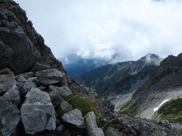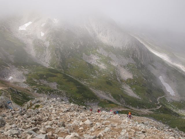 さて、3000m 級の山を制覇したぞ(2450m からの登りだけど..)、と満足感にひたりながら来た道を下山。雲も薄くなってきて、下から登ってくる人が見える。ホント、脚を滑らせたらと思うと..コワッ。