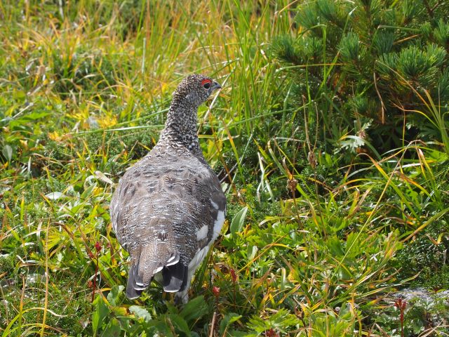 そのまま 室堂山 へ進んでいくと、「グワグワグワッ」と低い不気味な声!見ると立山のシンボルでもある雷鳥が!雷鳥まで見られるとは、なんとラッキーな。そろ~り、そろ~りと2mくらいまで近づいても逃げない。赤いアイラインがキリッとしておしゃれ。よい絵が撮れました。