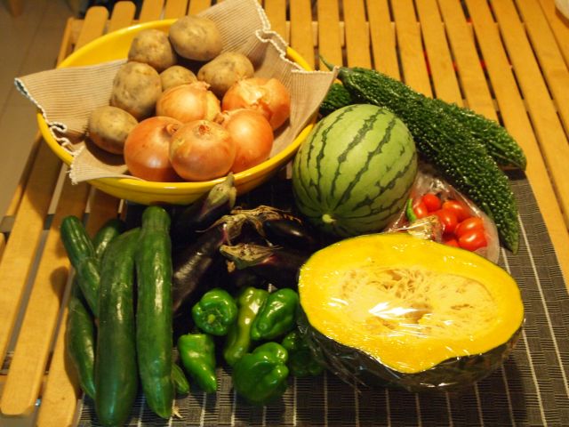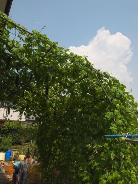 写真はゴーヤの日よけ。「自分でもいでいきな」と言われゴーヤ狩りに、トマト狩り、スイカ狩り。夕方までゆっくりさせてもらい、いろいろご馳走になる。
