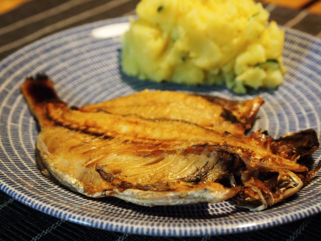 群馬でもらってきた野菜をあらかた片付け、今度は熱海で買ってきた干物、えぼ鯛です。残ってたジャガイモとキュウリで、ポテトサラダの付け合せ。