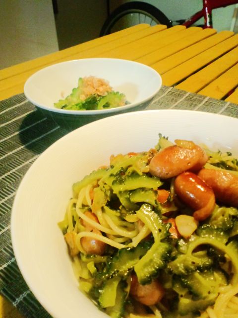 せっかくだから新鮮なうちに食べようと思ったが、卵も何も買ってないのでチャンプルーすら作れず、パスタにする。ゴーヤのほろ苦さに、たっぷりのニンニクと鷹の爪がピリリと利いていて、ウマシ!付け合せもゴーヤのお浸し。
