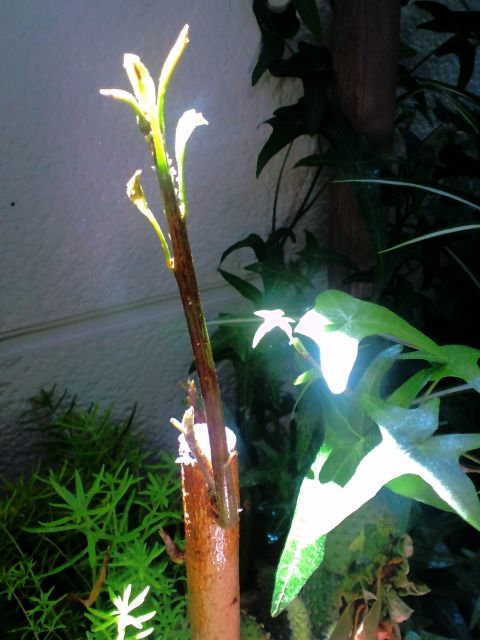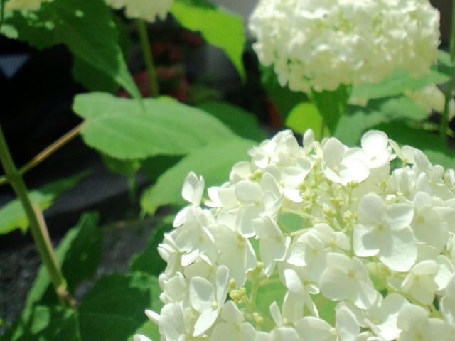 ※玄関横にあった枯れた鉢。いつの間にか伸びて、真っ白なアジサイに!