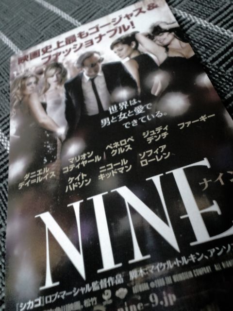 NINE、もう公開から1ヶ月以上経っていて、レイトショーだからガラガラでゆっくり観れるかと思ったら、ホボ満席。ストーリー的には、イタリアの大御所映画監督の女優達との浮気話でどーってことなく、舞台観てるような感じで演出を楽しむ映画です。舞台好きなら楽しめます。