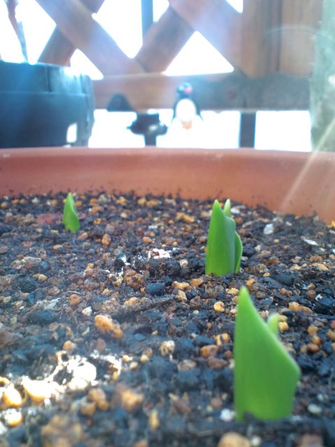 昨年秋に埋めておいた、水仙とチューリップの球根が芽吹いてきた。先に出てきたコッチは水仙だったかな..。