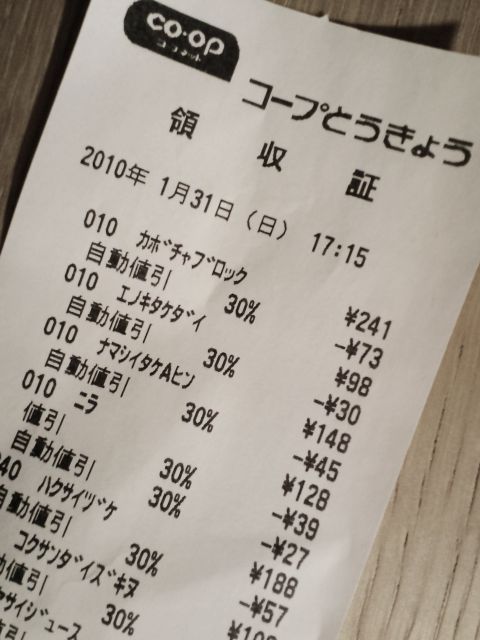 夕方帰ってくると、本日で閉店のコープが残り1時間を切って、客で溢れている。売りつくしセールをやっていて、冷凍食品は50%OFF、食品や雑貨は30%OFF!もう殆どの棚はカラっぽだったけど、みんなワレ先にと買いあさってスゴかったです。買い溜めしても日持ちしないからか、比較的残っていた野菜を中心にイロイロと購入。