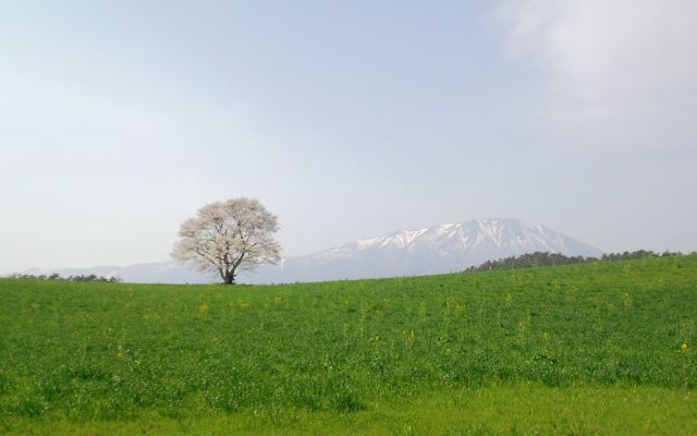 予定を変更して、まずは小岩井農場。雄大な岩手山を背景に咲く一本桜。散ってないか心配だったけど、ちょうど満開くらい。菜の花と新緑の草原がキレイ。