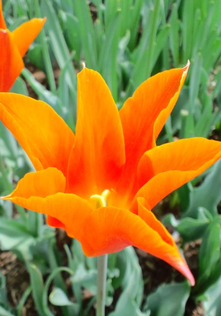 とんがったコレもチューリップ。緑にオレンジが映える。