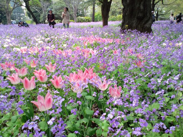 群生するムラサキハナナとチューリップ。