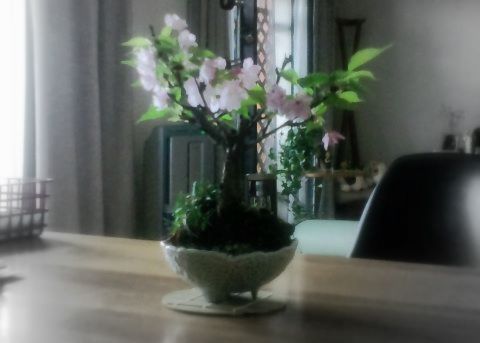 盆栽の桜がほぼ満開。ここ数日は、ダイニングテーブルでお花見しながら食事してます。