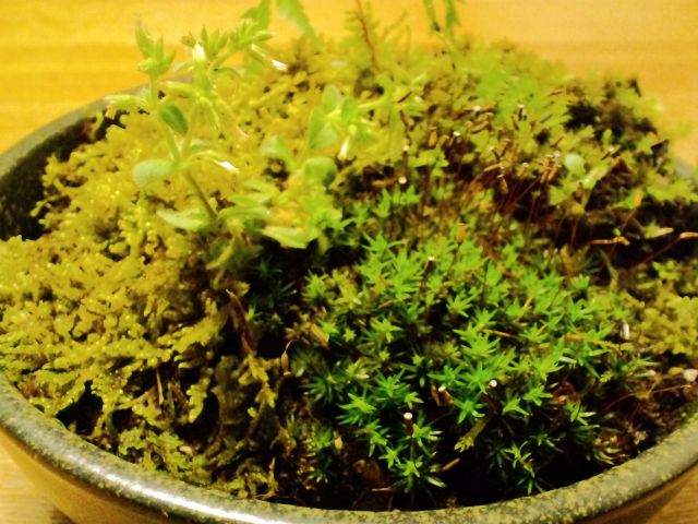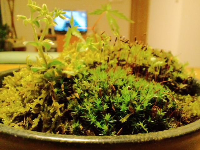 3種類の苔と、モミジと、湿地に生えていたよくわからない草をミックス。