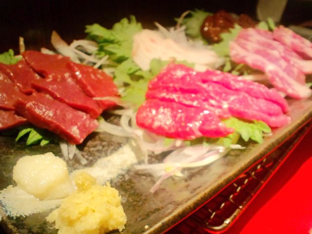 冷凍モノは使わずに、熊本から直送される新鮮な馬肉が食べられるということなので、まずは馬刺し盛り合わせ。通常の霜降り、ハツ、赤身、タテガミに、レバ刺しを加えた5点盛りにしてもらう。レバ刺しは入る日と入らない日があるそうな。