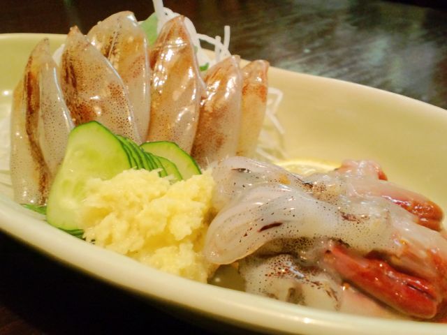 まずは、この時期旬の 生ホタルイカ。産卵前の身の張ったものが食べられるのは、この4月前後のみ。特にキモ付きのゲソ部分がおいしい!活ホタルイカもあったが、口の中で動かれても う~ん なのでヤメときました。黒部地ビールとともに..。