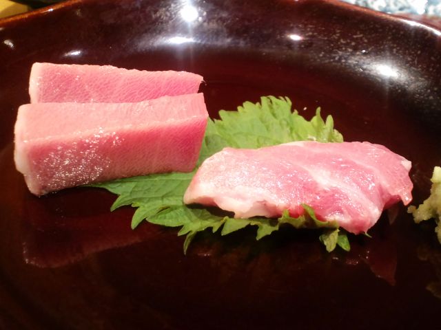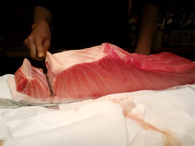 目の前のカウンターで「ここが大トロ、ここが中トロ」と切り落としてくれる。切った断面が少し黒ずんで見えるのは、空気に触れていないからなんだそうな。