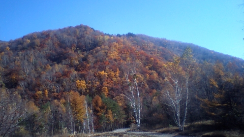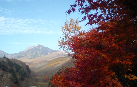 八ヶ岳高原スカイラインの清泉寮、赤い橋のある所は紅葉の名所だが、もうほとんど終わってました。わずかに残ったモミジなめの八ヶ岳。