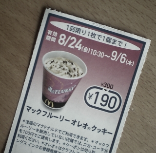 お気に入りマックフルーリー190円のクーポン券、9月6日までだった...ショック...。マックカフェ、人気みたいですね。