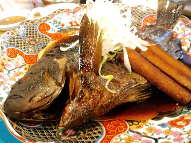 続いてメダイの煮付け。煮汁の染み込み具合が絶妙で、付け合せのゴボウがまたウマイ。その後、サクッと揚がったイカの天ぷら、にぎり寿司盛り合わせと続く。